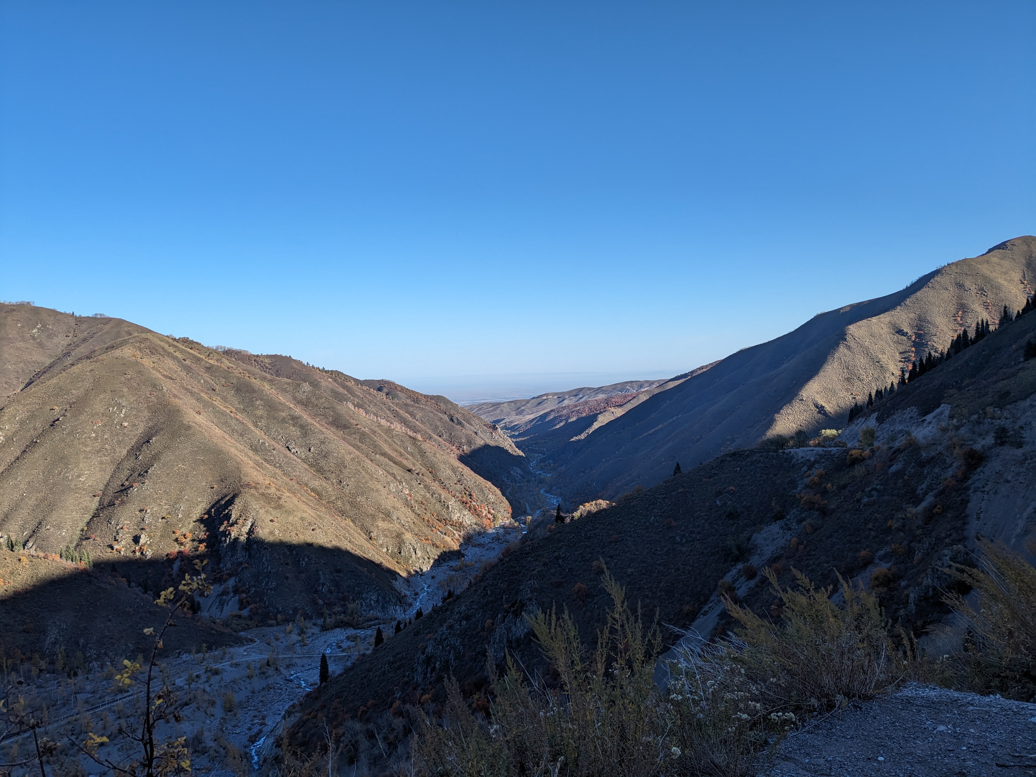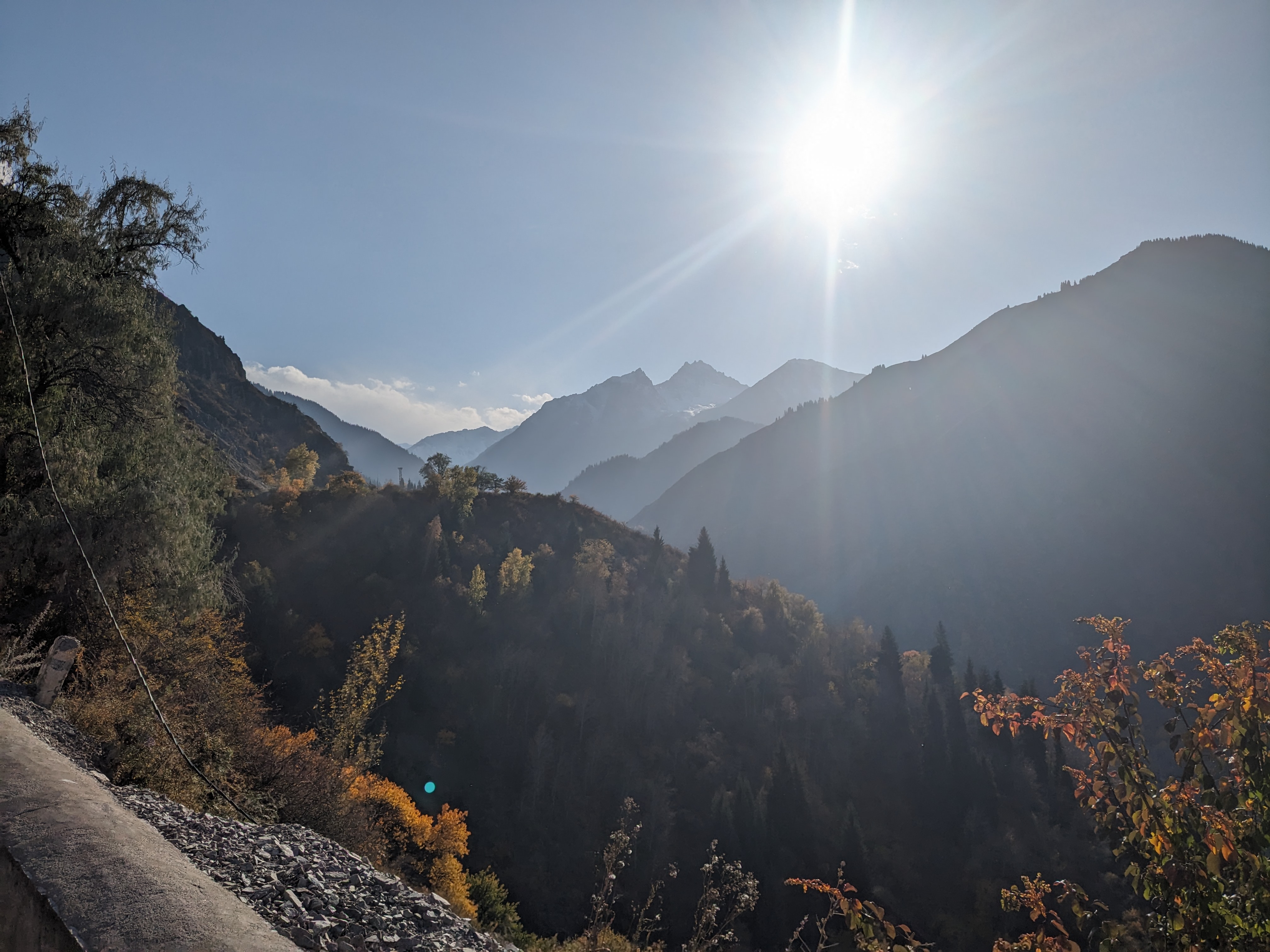Later that day, I entered one of Kazakhstan’s national parks costing me about a pound and cycled up a valley to spend the night at Lake Esik. This breathtaking lake hidden away in the mountains displaying a vibrant green-blue hue from glacial flow. While the lake was quite busy with people during the day, I had the place to myself that evening.