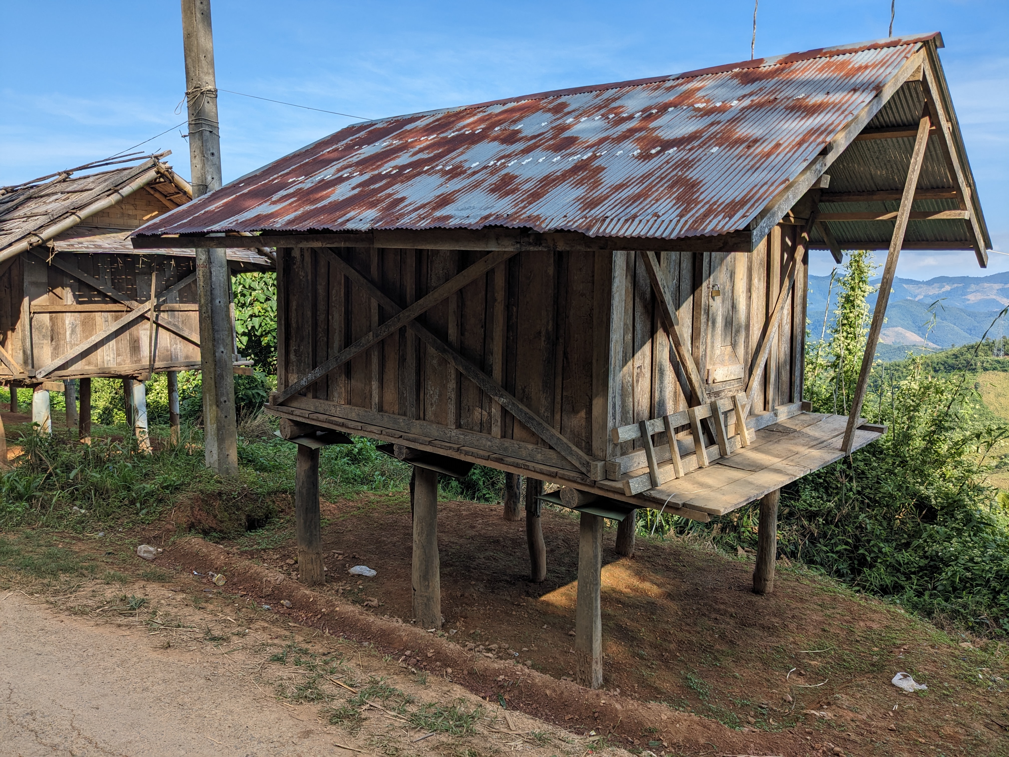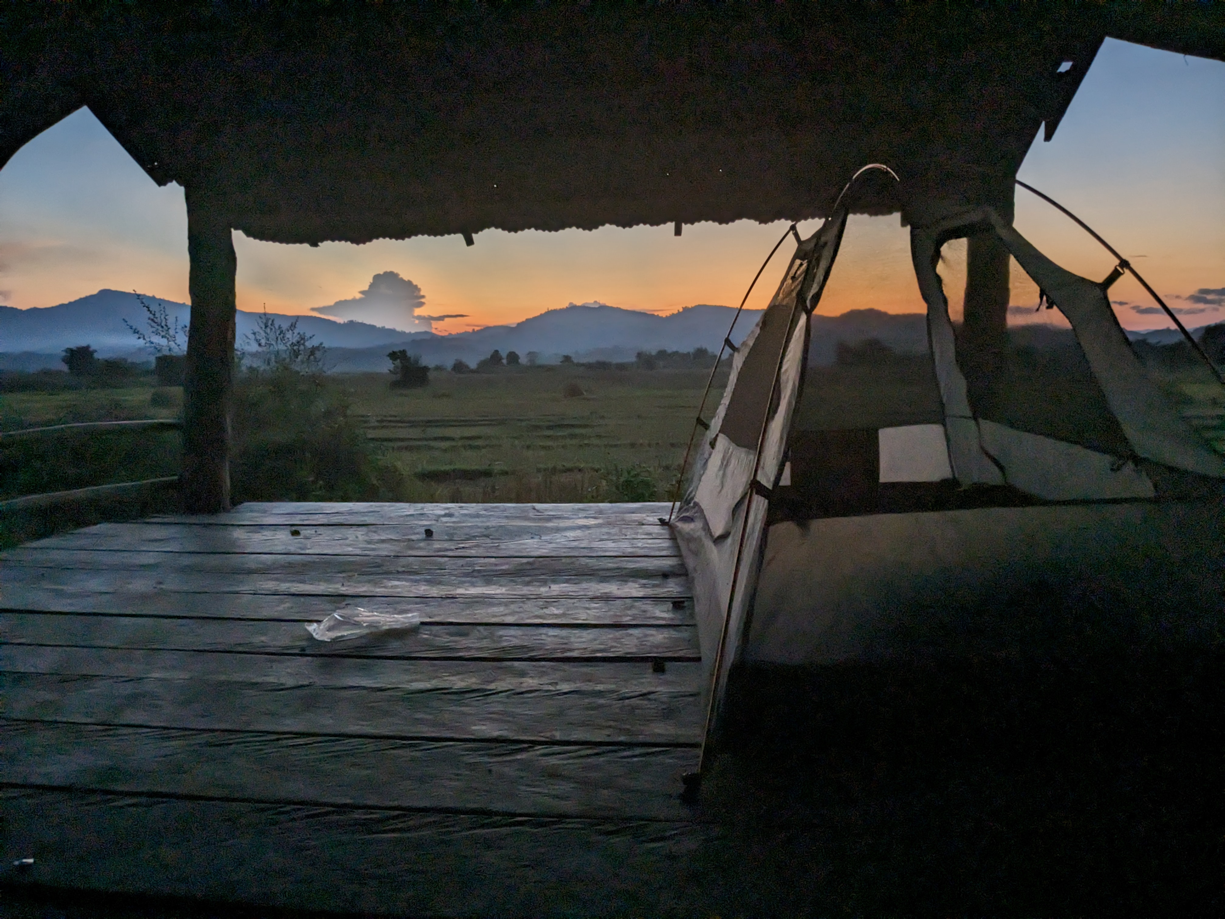 As evening fell, I was called over by some guys at a roadside bar and offered a BeerLao. This led to a shared meal of sticky rice and BBQ beef. One of them spoke enough English for us to communicate and explained they were miners, the trucks were coming from the mine and I could stay in their accommodation. After a short walk back to the accommodation we were stopped by security at the gate who said I couldn’t stay. Fortunately, the security guards offered for me to camp with them and I shared another meal then set my tent up in their shelter complete with electricity!