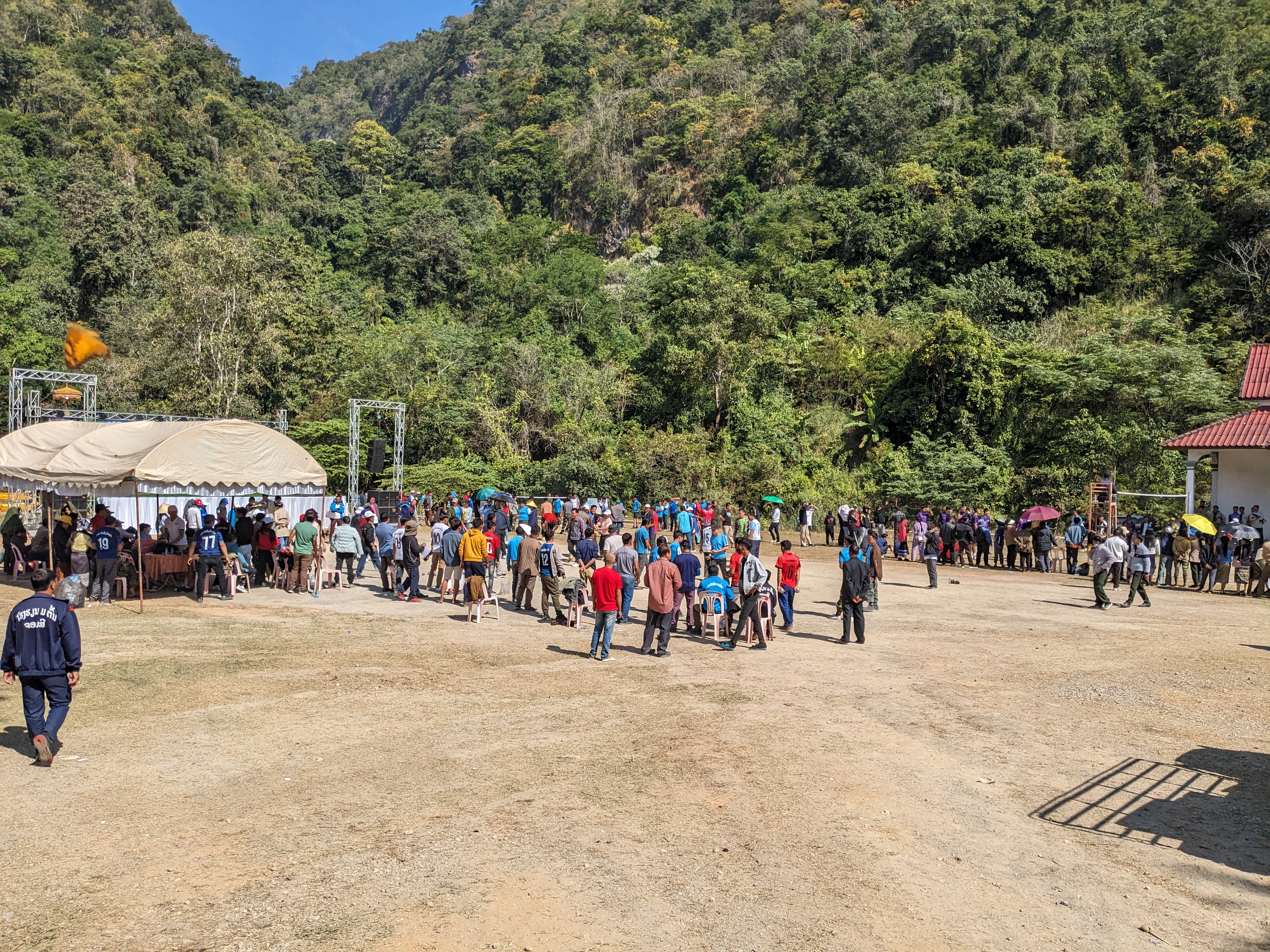 The journey continued on busier roads through towns adorned with communist flags something I hadn’t seen so far in Laos dispite it being a communist country. I quickly realised why they were so prominent here when I arrived at the Tham Piew cave. On 24th November 1968, 374 civilians were sheltering in the cave when the US launched a rocket at the cave killing everyone. It is a tragic story and was interesting how at the associated museum all the exhibits very explicitly blamed the US. I was there just 2 days before the anniversary, so there was a festival in action making me feel very out of place.