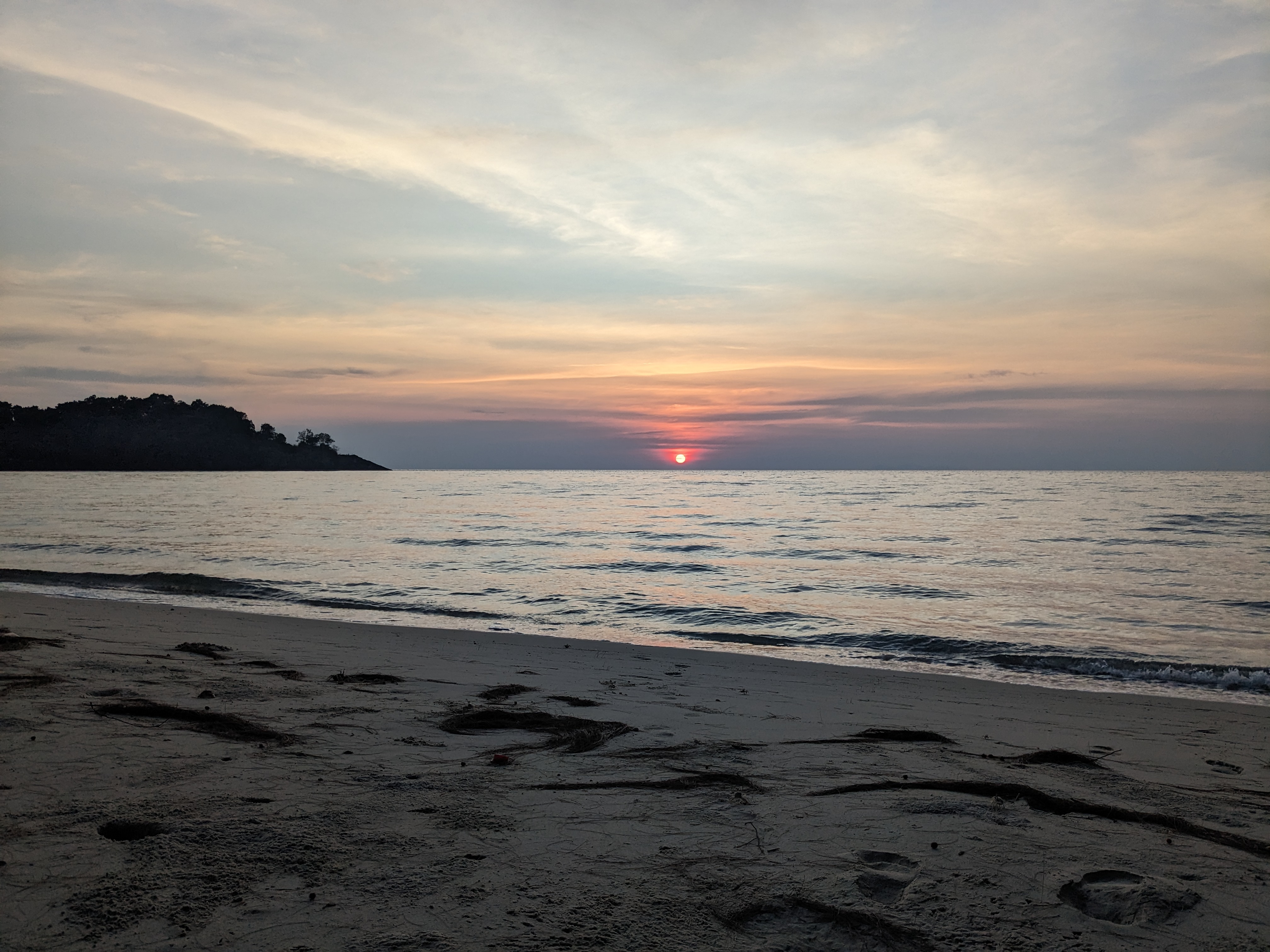 I was excited to cross back into Thailand, where I made good progress along the well-built roads. I took a brief stop at the narrowest point in the country, although it seemed more symbolic than an actual tourist attraction and the only thing of interest was the sign. My dream was to sleep on a wild beach that night, and after spotting a small track that lead to the coast I found the perfect spot offering an amazing sunset.