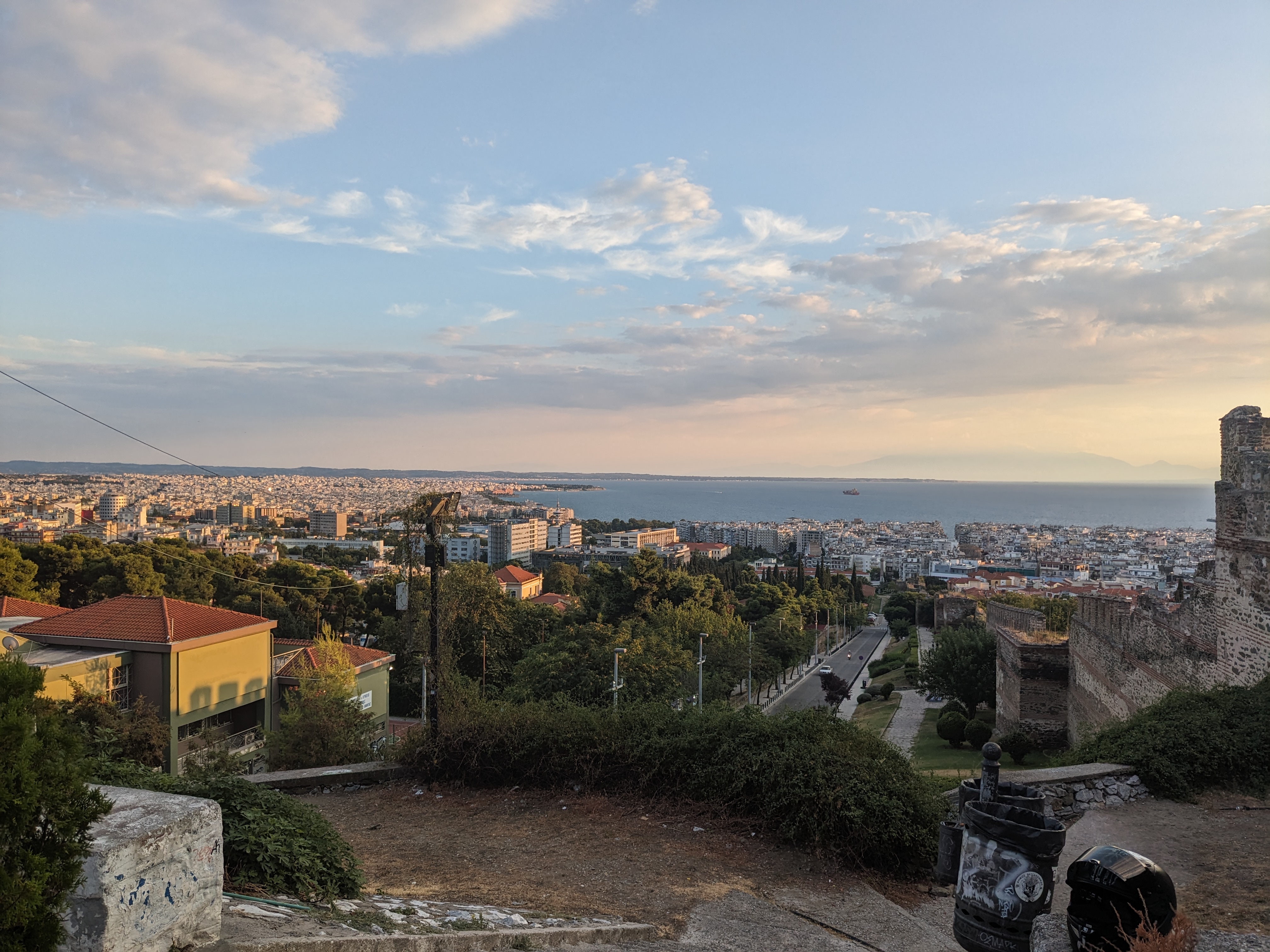 Thessaloniki proved to be a busy touristy city with a large harbour but nowhere really to swim. That evening, I peddled into the nearby hills to set up camp and enjoyed a view overlooking the city.