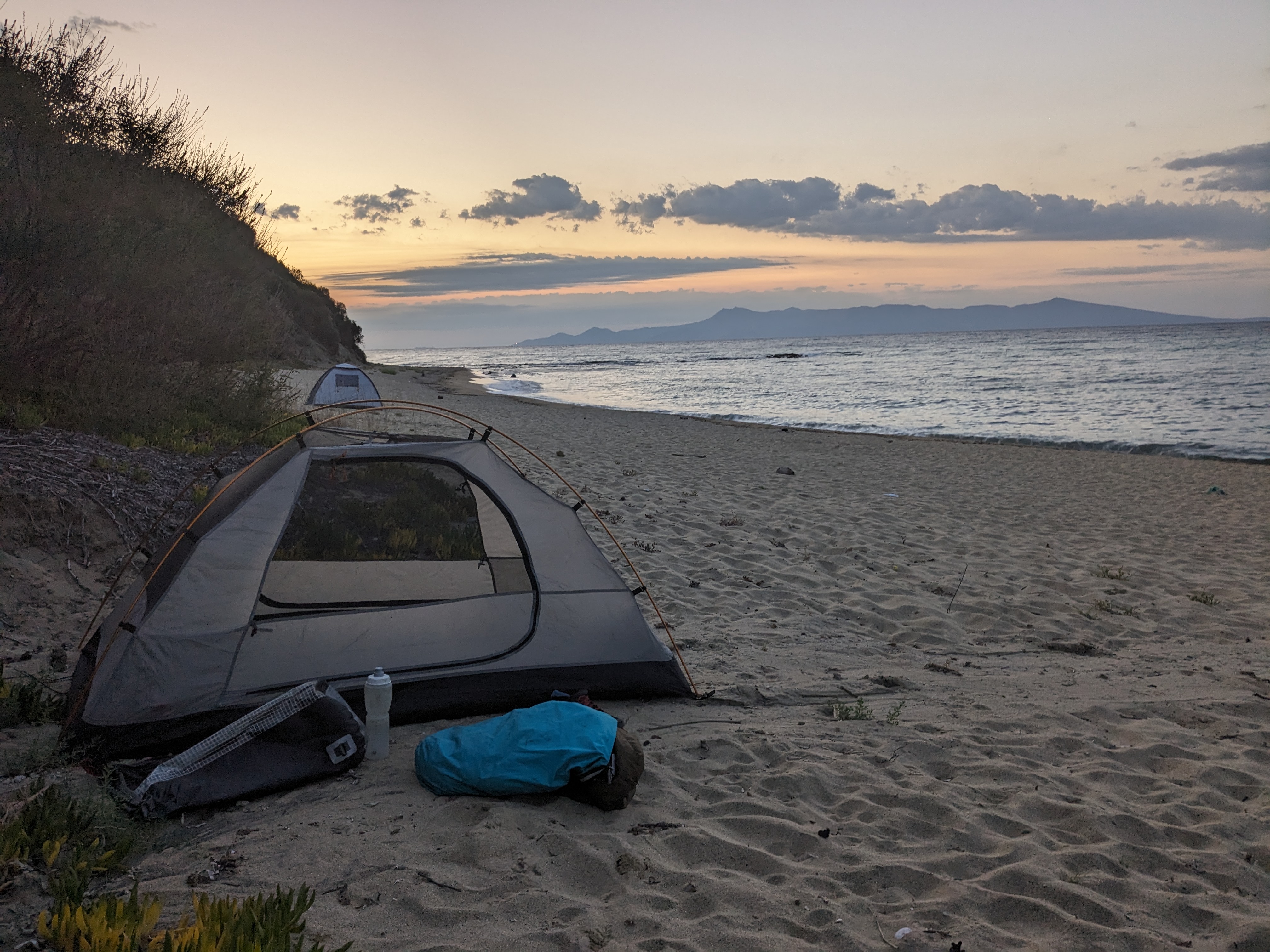 On the third day, I joined a road that would essentially lead me to Turkey. The towns along the way boasted bustling beaches with rows of umbrellas and vendors selling shade, which made the cycling somewhat mundane. Nonetheless, the main road facilitated efficient progress. That night, I ventured to a beach for dinner and a swim, hoping to camp there if it was quiet enough. There were a few tents set up already on the beach and when enquiring with one of the campers if I could sleep there for free he said it should be fine.